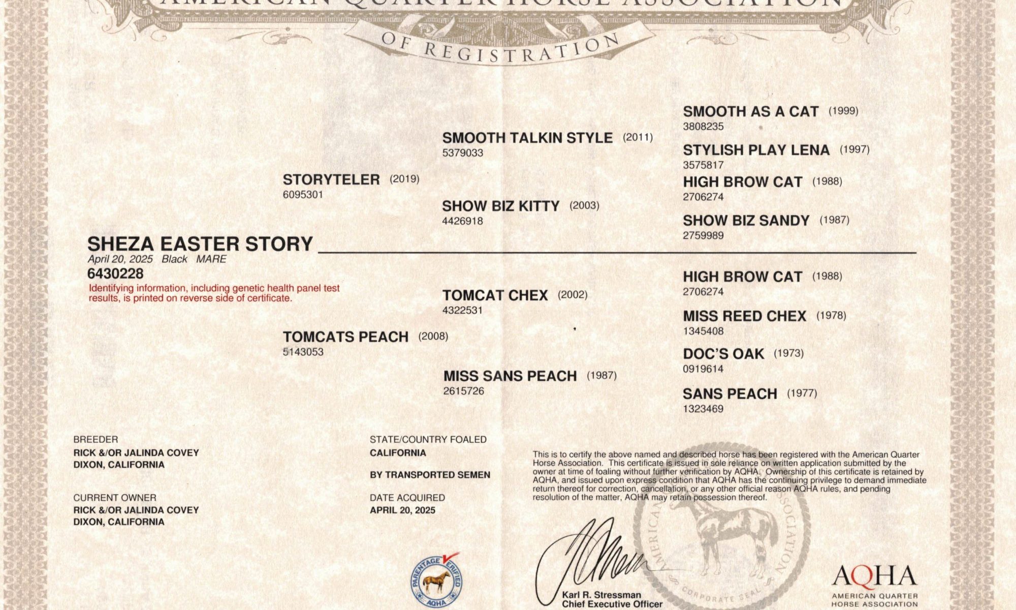 Sheza Easter Story – Born on Easter this 2025 Black Filly by Storyteler out of Tomcats Peach. 6 panel N/N