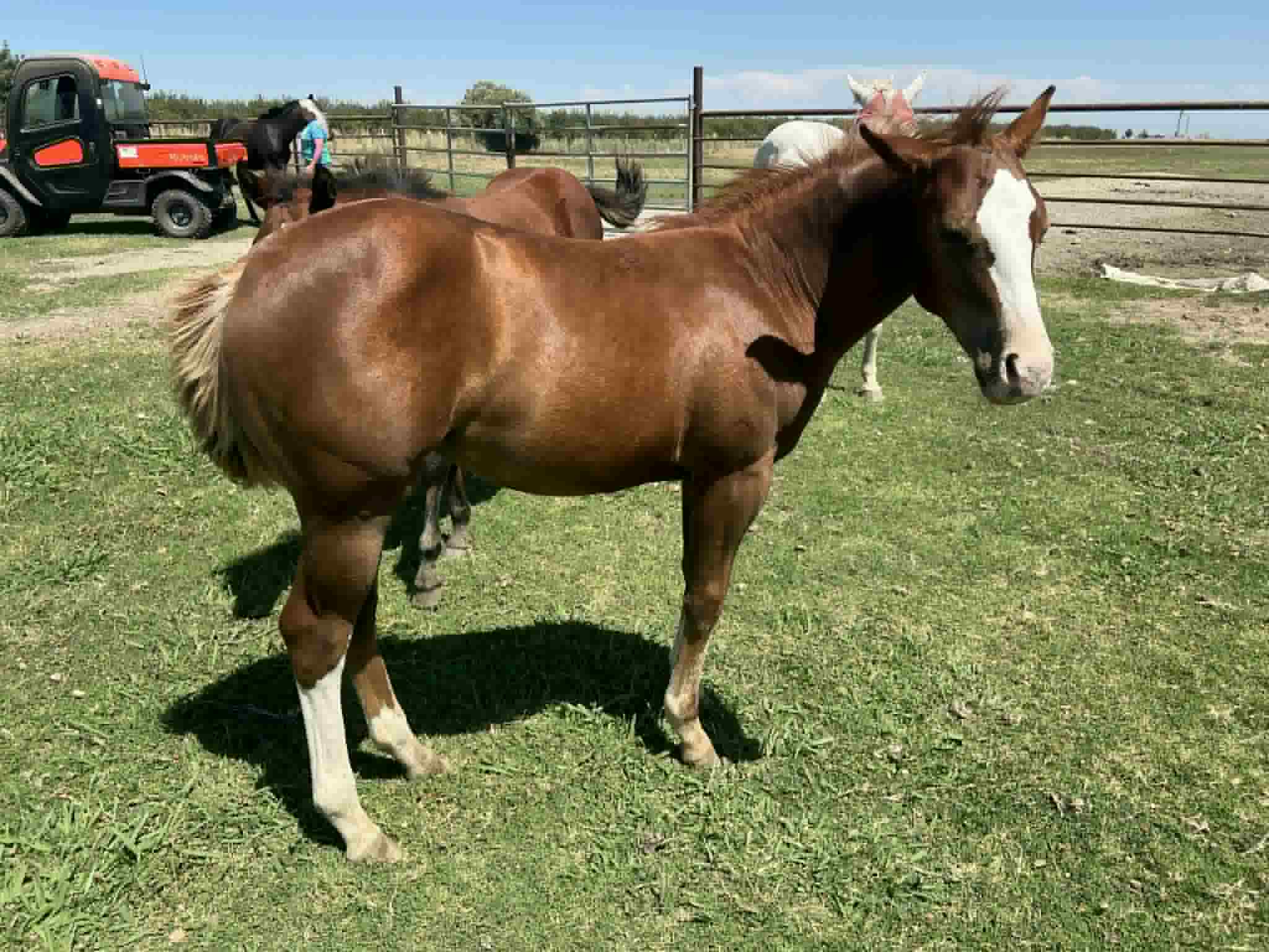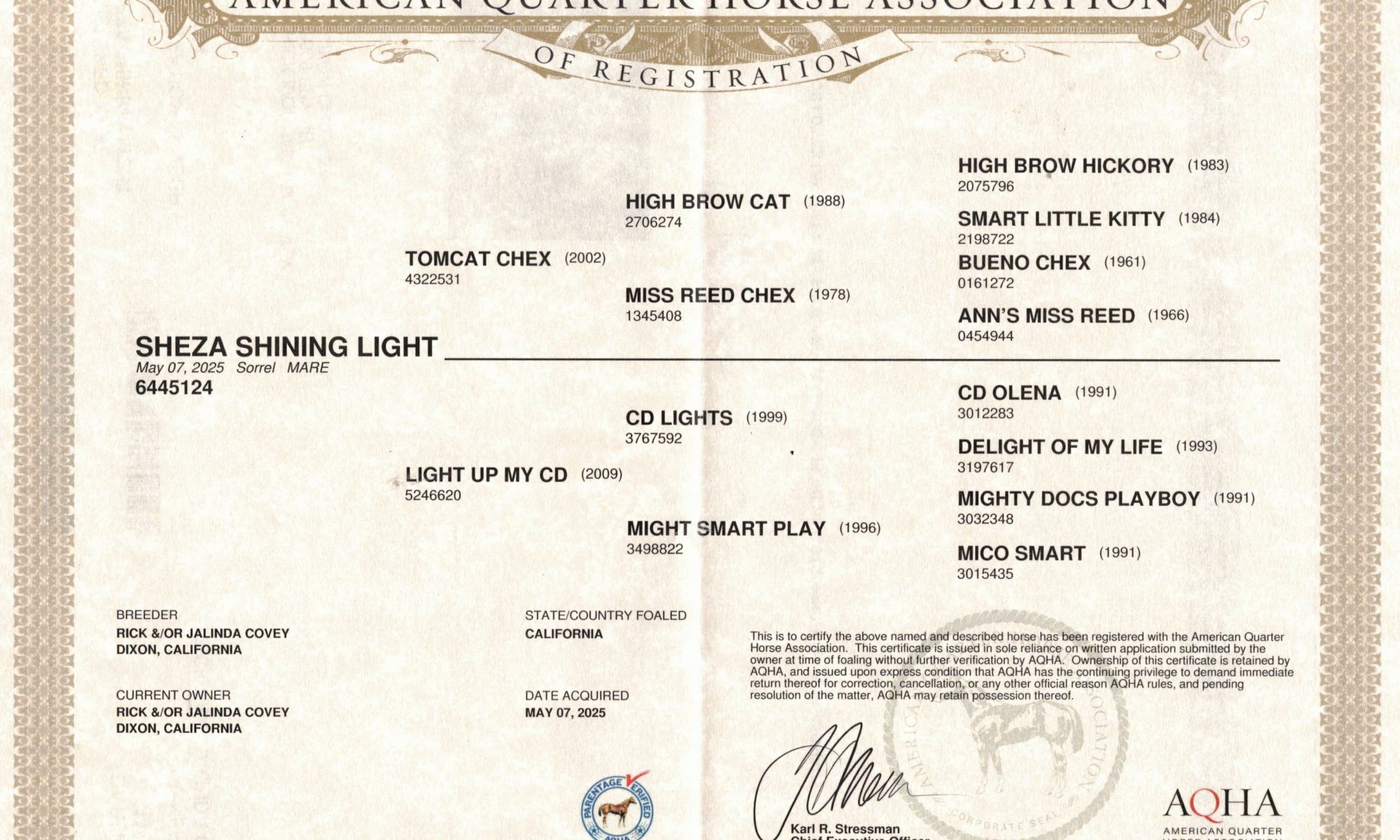 SHEZA SHINING LIGHT- 2025 Gorgeous sorrel filly sired by Tomcat Chex NCHA LTE $148K out of Light Up My CD by CD Lights. Talk about SHINE, this filly has so much chrome she is sure to be a show stopper. Her full siblings are NCHA & NRCHA money earners with Champion titles. Her dam, Light Up My CD was injured as a 3 yr old, but her offspring have PE of $60K + Her dam Might Smart Play has NCHA LTE $27,853. And PE $102,000. Dam of Smooth And Might 2015 NCHA World Champion $30,502.02. She had a gorgeous 2016 bay filly by Tomcat Chex, Heavenly Lights. She was a El Rancho Open and Intermediate Open Futurity Finalist, the PCCHA Limited Open Reserve Futurity Champion and placed 3rd in the PCCHA Amateur Futurity. Heavenly Lights has LTE of $18,305.16. She was shown by Kirk Ferris in the Open and Jack Ferris in the Amateur. Light From Above and Clint Swales are the NRCHA Open Bridle Champion AB Canada for owner Chrissy Hodgkiss. Her offspring have won money in Roping, Rein Cow Horse and Cutting.