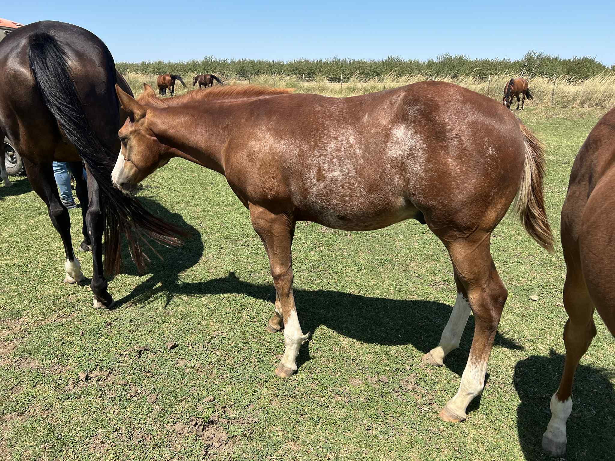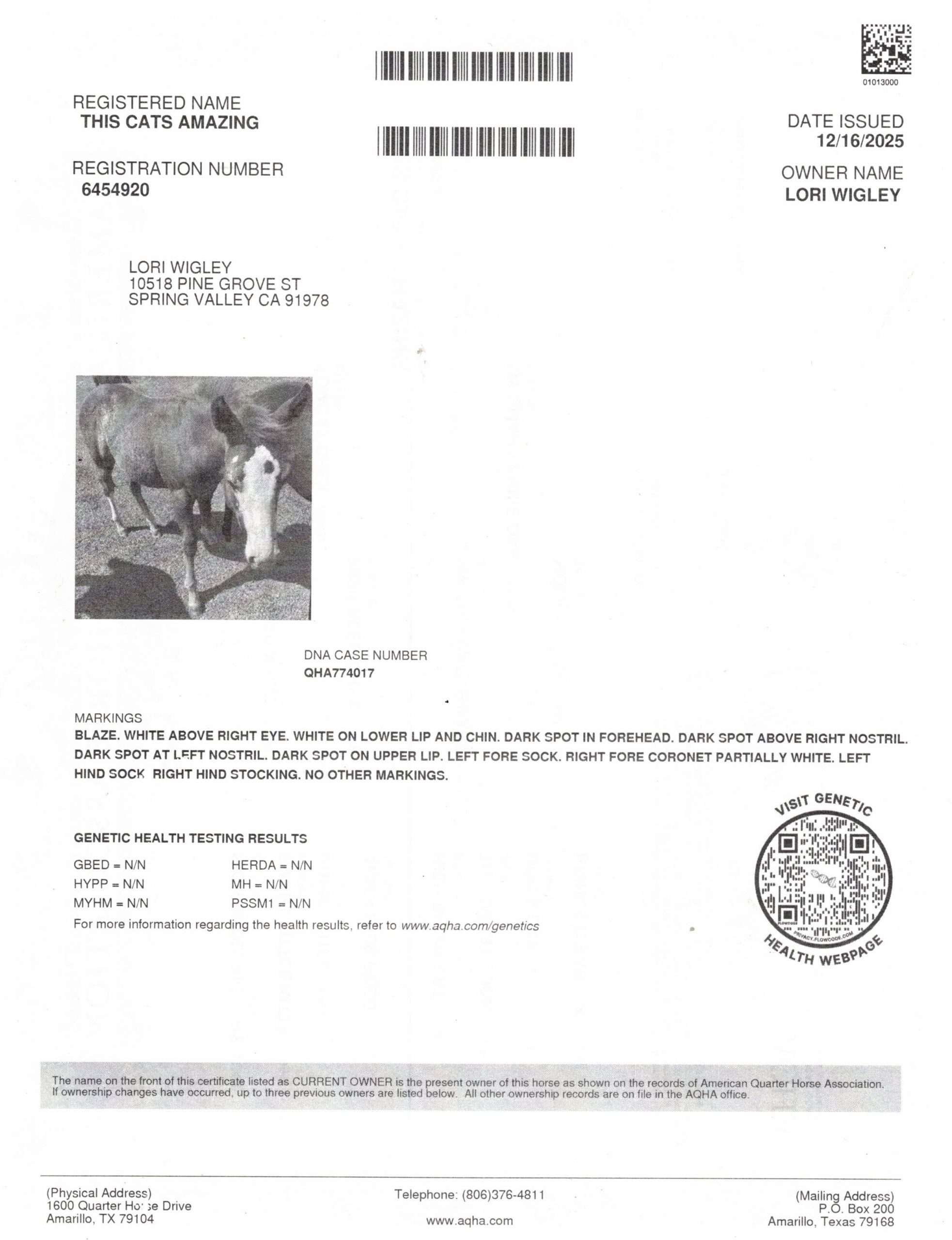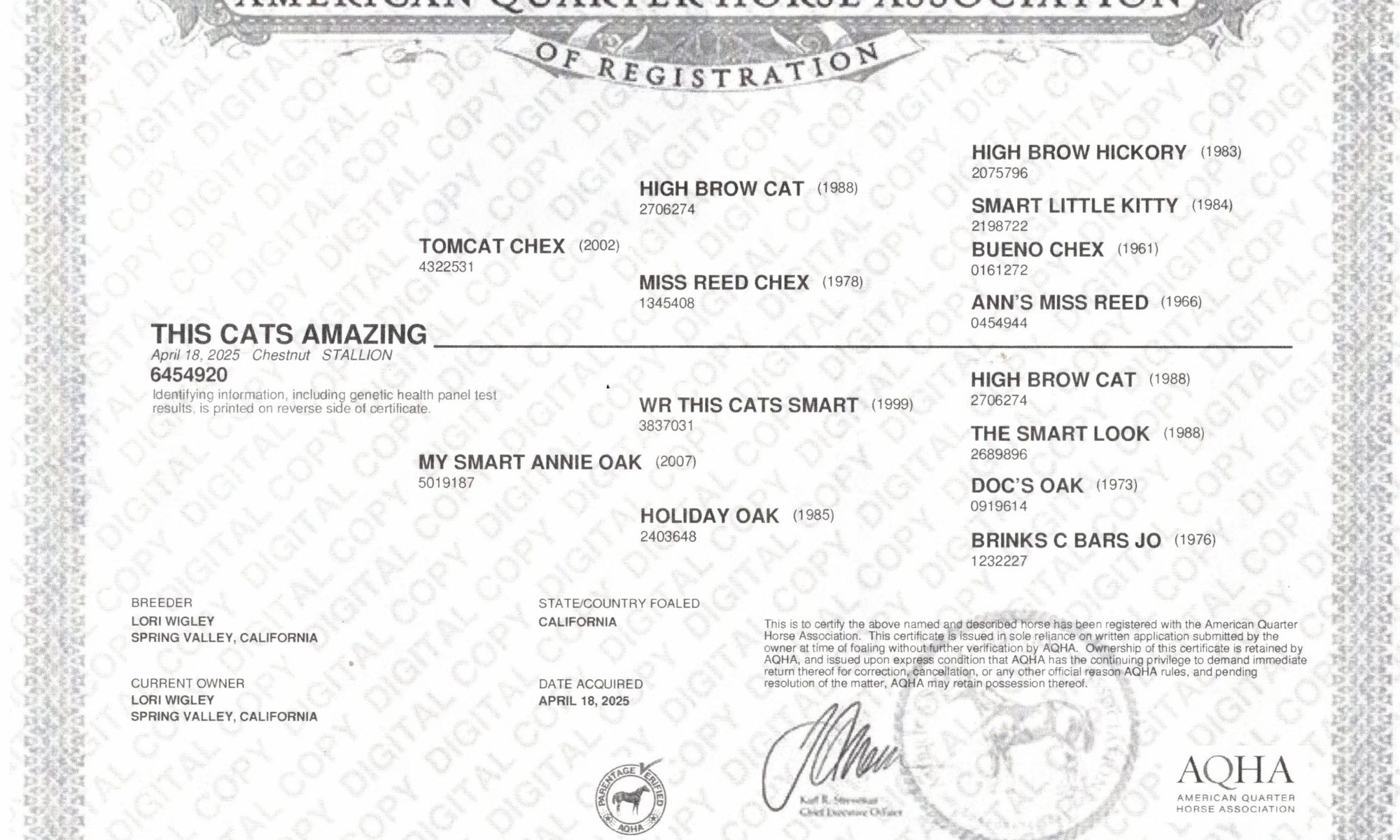 THIS CATS AMAZING – 2025 Chestnut Colt sired by Tomcat Chex NCHA LTE $148K NCHA Novice World Champion Stallion, National Champion, NCHA World Novice NP Res. Champion. His dam is My Smart Annie Oak LTE $1366.65 (was injured as a 3 yr old) she is by NCHA World Champion sire, WR This Cats Smart LTE $236,514.00 and offspring have won $18.3 Million! He has been an All Time Leading Sire in NCHA & NRCHA since 2010, First dam, Holiday Oak LTE $8,243.14 by Doc’s Oak LTE $71,000. PE $10 Million. Daughters of Doc’s Oak are excellent producers with over 16.8 million in offspring earnings.